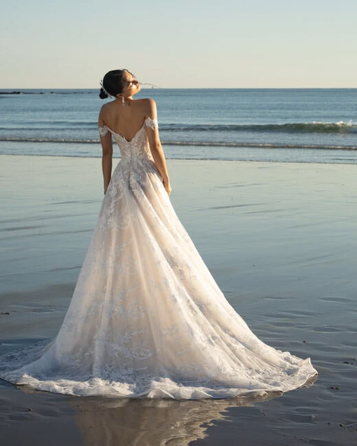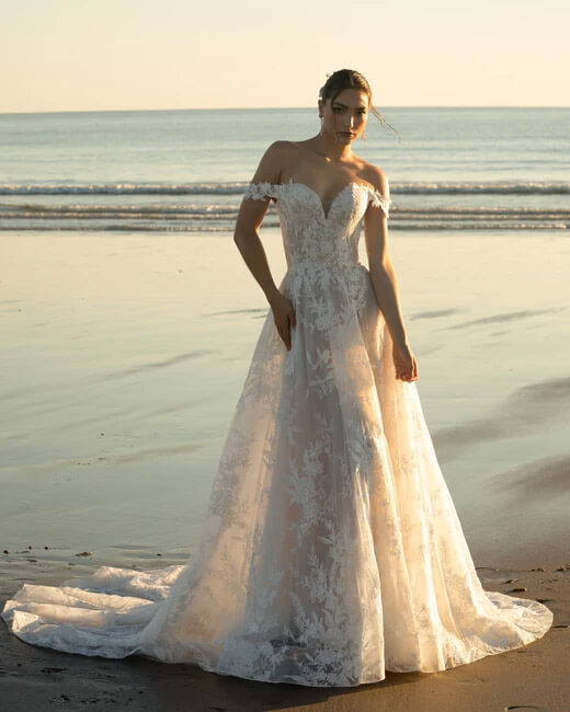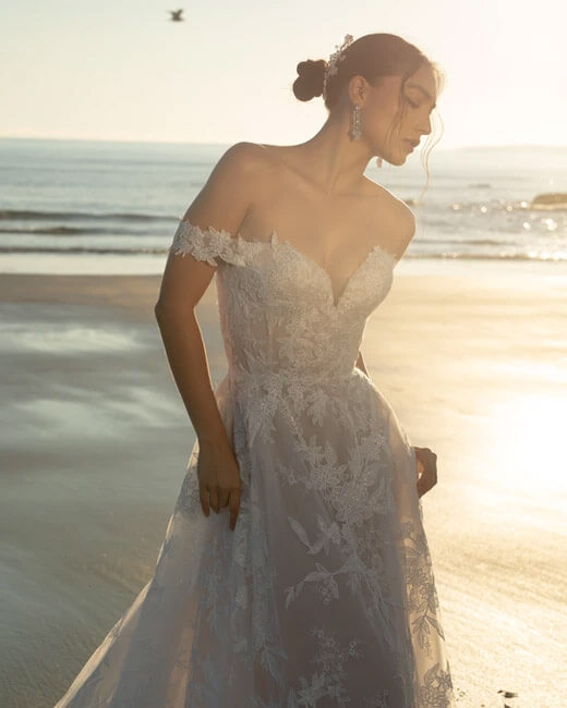 Nesa is soft and airy with a fully lined off the shoulder bodice. Inesa’s a line style is adorned with delicate lace and modern pearl buttons.